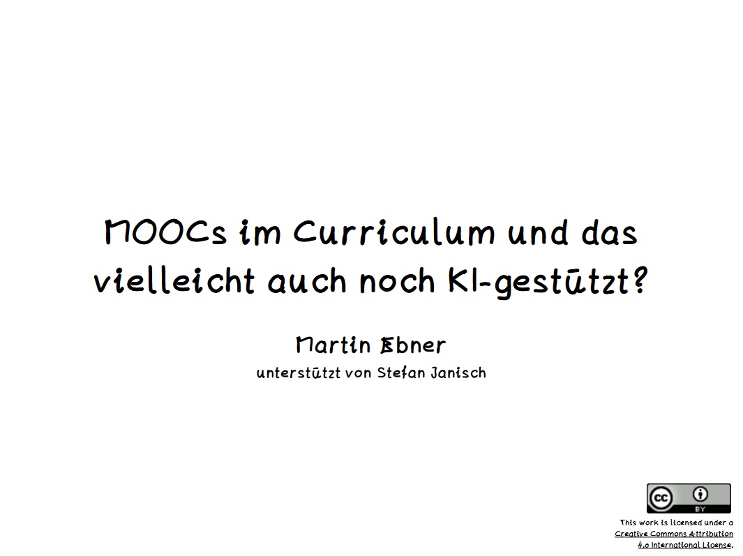 Massive Open Online Courses sind heute nach ihrem anfänglichen Hype fast schon Hochschulalltag, dennoch bleibt die Frage wie man diese in Curricula einbetten und verwenden kann. Der Workshop gab einen Überblick über bisherige Erfahrungen mit der nationalen MOOC-Plattform iMooX.at und zwar (1) hinsichtlich didaktischer Szenarien für den Einsatz in der Hochschullehre und (2) KI-gestützter Erstellung. Der Workshop lud ein zur Diskussion und Reflexion bzw. sollte helfen die eigene Hochschullehre weiterzuentwickeln.