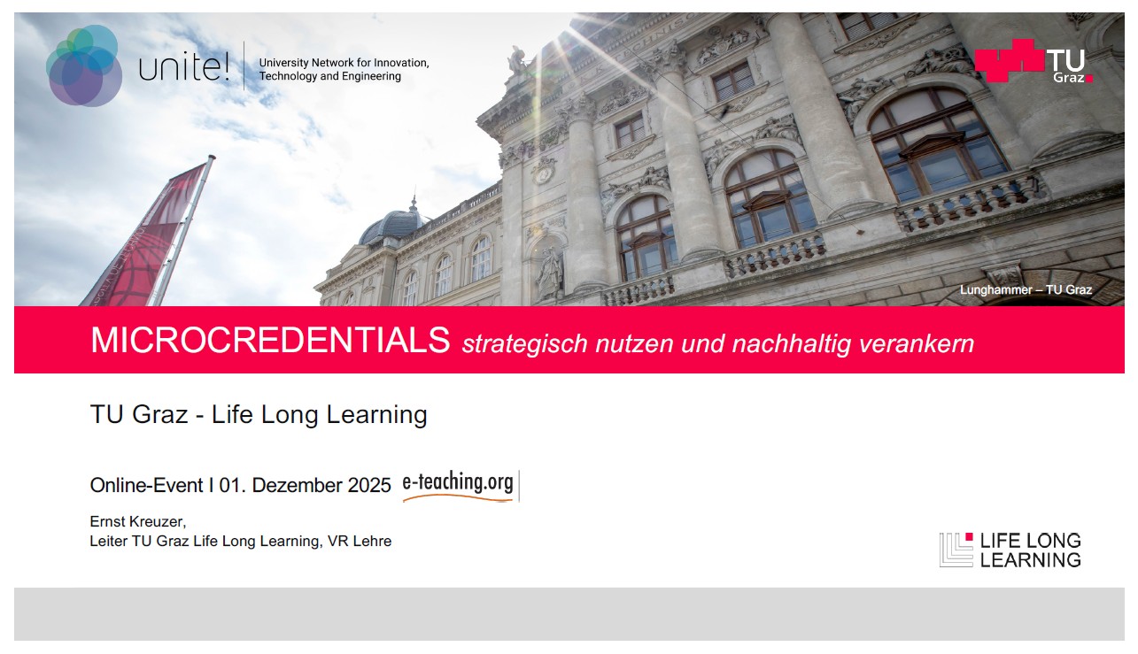 Als „Microcredentials“ werden Nachweise von Lernergebnissen bezeichnet, die im Rahmen von Lerneinheiten erworben wurden, die weniger umfangreich sind als klassische Hochschulveranstaltungen. Im Online-Event diskutieren Hon.-Prof. Ernst Kreuzer (TU Graz) und Mag. Christina Raab (Univ. Innsbruck), welche Potenziale und Herausforderungen mit der Gestaltung und Anerkennung von Microcredentials verbunden sind – und ob und wie sie sich in klassische Curricula integrieren lassen.