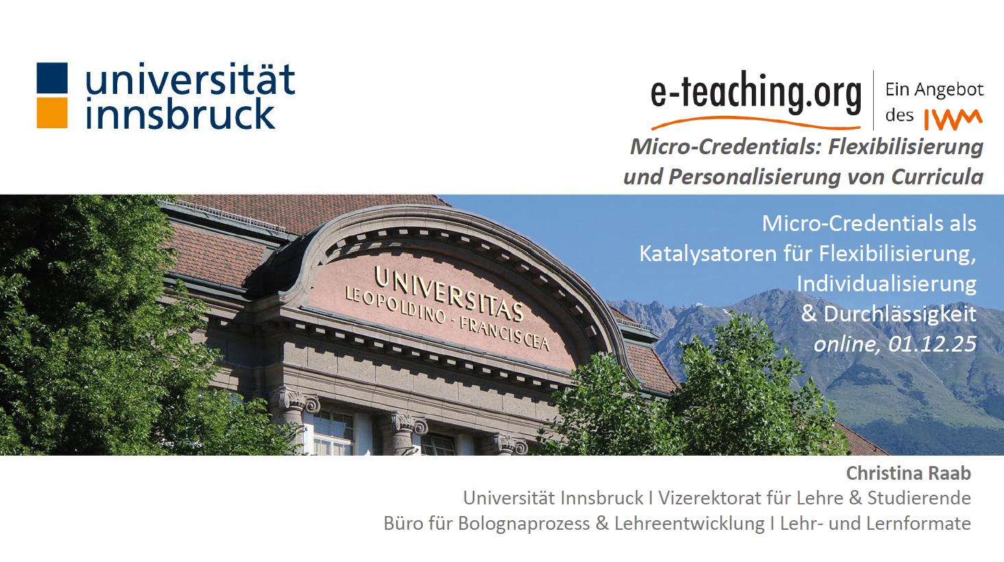 Im einleitenden Beitrag des Online-Events fragt Mag. Christina Raab (Univ. Innsbruck) deshalb zunächst danach, ob traditionelle Studien und Microcredentials in einem Konkurrenzverhältnis zueinander stehen – oder ob Microcredentials vielmehr das Potenzial bieten, zur Flexibilisierung und Individualisierung akademischer Bildung beizutragen. Dabei geht sie vor allem darauf ein, inwiefern Microcredentials als Katalysatoren fungieren können, um die Grenzen zwischen formaler und non-formaler Bildung zu überwinden und dadurch qualitätsgesichert zur Anerkennung und Validierung bereits erworbener Lernergebnisse beizutragen? Der Beitrag geht diesen Fragestellungen nach, beleuchtet die damit verbundenen Herausforderungen und zeigt mögliche Lösungsansätze auf.